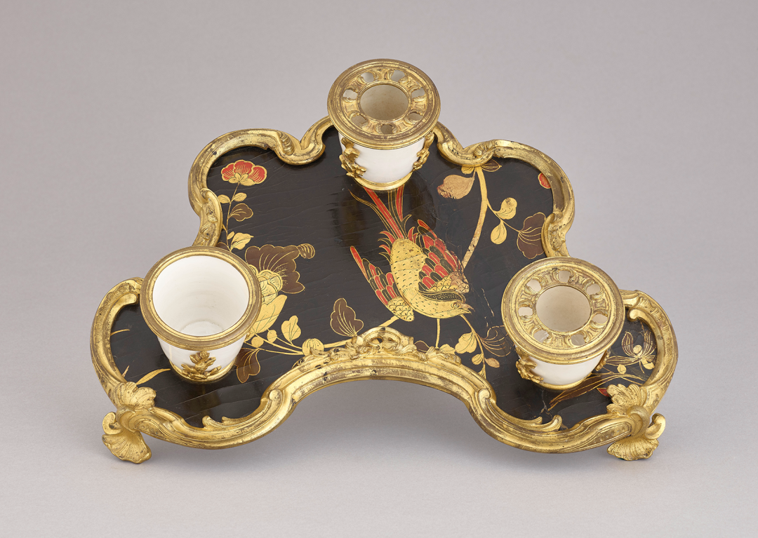 法国18世纪已有将中国瓷器镶嵌改装为墨水台的先例,卢浮宫藏有以三件德化窑白釉杯与一块东方漆板镶嵌组合而成的墨水台。