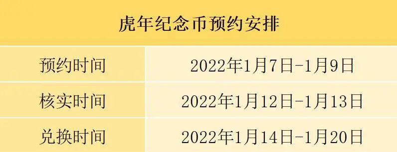 根据中国人民银行公告,虎年纪念币将于2022年1月7日-1月9日期间进行面值预约,每个身份证最多可预约20枚。具体时间安排如下: