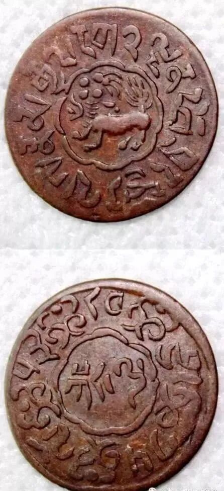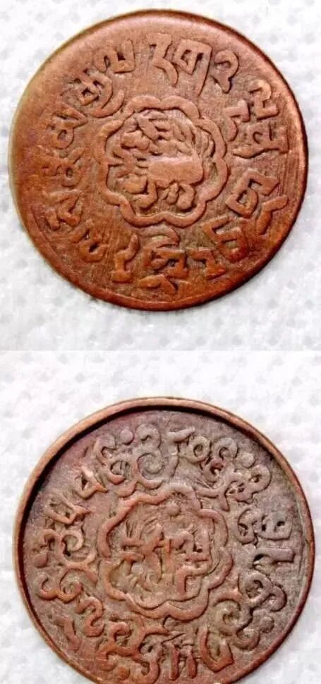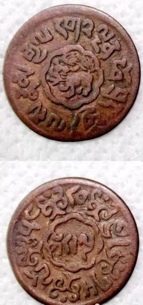 嘎旋铜币,1918年至1922年(藏历第15饶迥第52至56年),由西藏“梅吉造币厂”铸造。有5个异年版别,其中藏历15-55年和藏历15-56年有在币值上带点版式,故名丹珠嘎旋,55年稀少,56年多见。