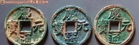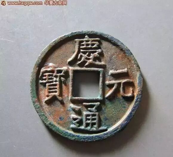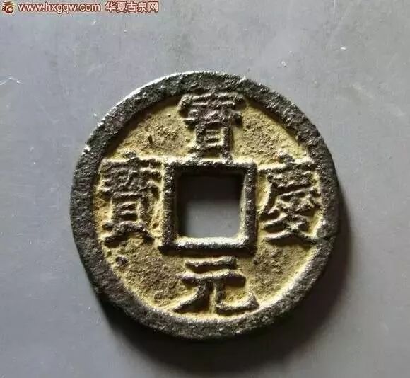 南宋宁宗庆元年间(公元1195~1200年)铸造,有小平、折二、折三等,铜、铁均有,种类较多,另有庆元元宝。庆元通宝种类较多,铜钱小平、折二背记年市场价格在20元左右,折三背记年“四、五、六”市场价格在300元左右,折三背记年“三”属试铸性质,存世稀少,市场价格在2.5万元左右,另有折五型背“永”大钱,瘦金体书,罕见,普通小平铁钱市场价格在50元左右,折二、折三铁钱在30元左右。庆元元宝铁钱不难见到,均为巩州惠民监铸,普通品种市场价格在50元左右。