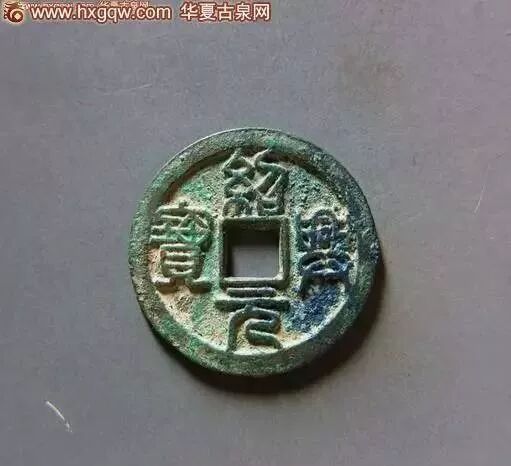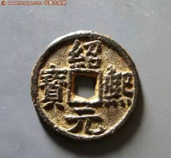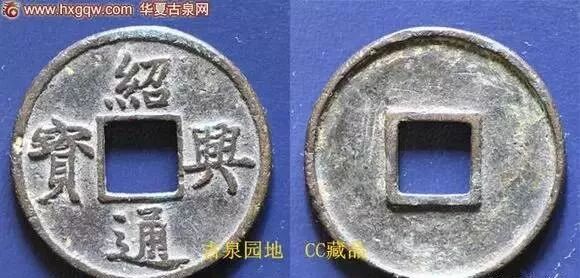 南宋高宗赵构绍兴年间(公元1131~1162年)铸,有小平、折二,铜、铁均有,铜钱官铸小平较稀见。绍兴元宝官铸小平铜钱较稀见,目前市场价格在1万元左右,折二常见,市场价格在30元左右,另有铁钱,不多见。绍兴通宝小平铜钱市场价格在500元左右,折二多见,市场价格在20元左右,折三、折十旋读大钱,形制类似大观通宝折十,存世罕见,为古钱名珍,近年国内无上拍记录。