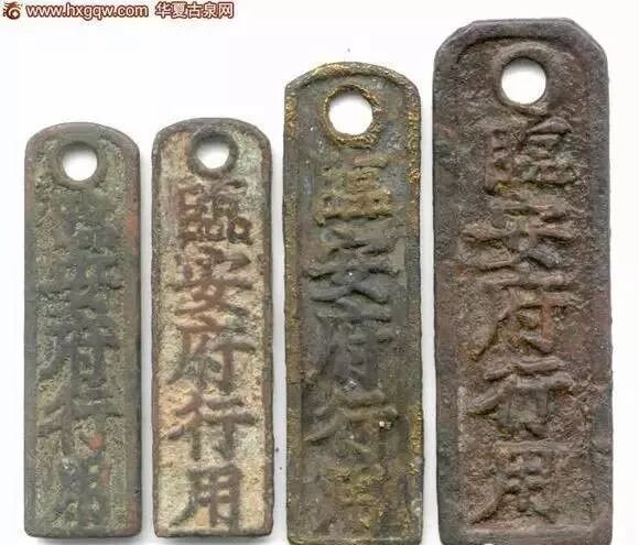 南宋末年因通货膨胀,政府铸行的虚值钱牌,分铜、铅两种,呈条形,上端有圆穿。正面铸“临安府行用”五字楷书,铜牌背铭“准二佰文省”,“准三佰文省”及“准五佰文省”,铅质面额较低。“省”意“省陌”,即以不足百数这钱作百数使用。存世均罕。正面均铸钱文“临安府行用”五字楷书,铜质牌背铭“准二佰文省”,“准三佰文省”及“准五佰文省”;铅质则低额,记“准一十文省”“准四十文省”等。目前发现的面值有十文、二十文、六十文、一百文、二百文、三百文、五百文数种。临安府钱牌形制特殊,存世稀见,铜钱牌铸造精美,为古钱名珍,2008年嘉德秋拍一枚五百文铜钱牌成交价格为13.4万元。