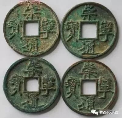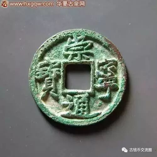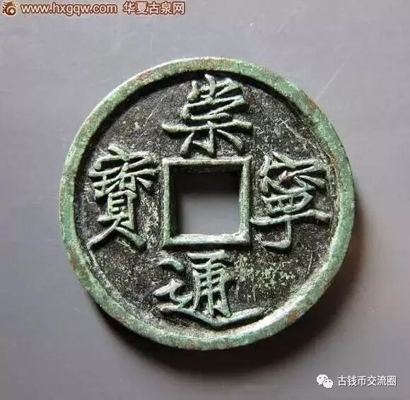 北宋徽宗赵佶崇宁年间(公元1102~1106年)铸,崇宁通宝钱文为徽宗亲书, 书法清秀骨瘦,铁划银钩,是徽宗瘦金书体存留世间的真实显现。崇宁通宝有小平和折十两种,小平较少见,市场价格在1000元左右。折十铸量极多,版式复杂,但因铸造、文字精美,较受市场欢迎。普通版市场价格在30元左右,大字版稀见,市场价格在10000元左右,亦有铁钱,常见,铁母市场价格在1.5万元左右。