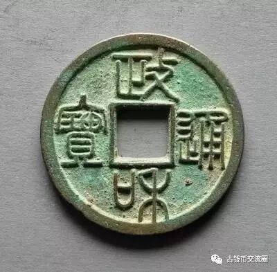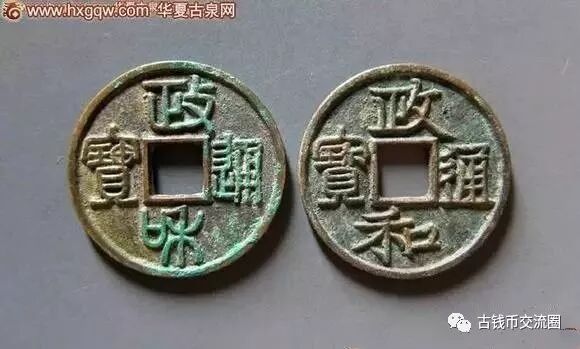 北宋徽宗政和年间(公元1111~1117年)铸,有小平、折二,铜、铁均有,常见,版式较多,另有政和重宝。政和通宝铸量大,普通版市场价格2元左右,较有名的版别有重和样、文政和等,均有对钱,单枚市场价格在300~1000元,折二铁钱常见,铁母市场价格在3万元左右。