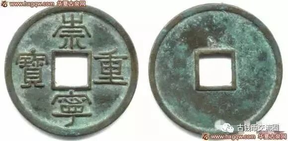 北宋徽宗赵佶崇宁年间(公元1102~1106年)铸,崇宁重宝为隶书铜、铁大钱,制作多精好,存世较多。崇宁重宝铸量极多,版式复杂,普通版市场价格10元左右,大字长足宝少见,市场价格在6000元左右。背“十”字者为铜钱中的名誉品,市场价格在2万元左右,另有铁钱,亦多见。