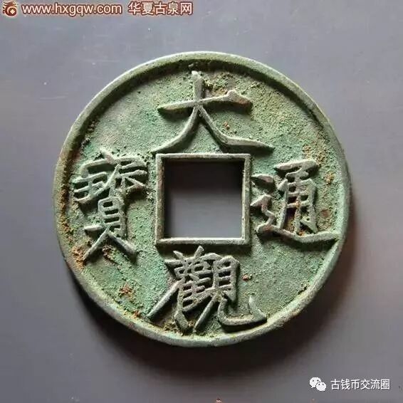 北宋徽宗赵佶大观年间(公元1107年~1110年)所铸年号钱,有小平、折二、折三、折五、折十等数种折值,铜钱钱文为徽宗御书“瘦金体”,铸造精美,尤以折十为最,铁钱有行书,小平钱常见,版式多样。小平钱常见,普通版价格在5元左右,小平中最珍贵的是行书铁母,钱文如行云流水,市场价格在10万元左右。折二铜钱市场价格在2000元左右,折二铁母在2万元左右,折三市场价格在3000元左右,折五应为试铸,稀见,折十美品市场价格在1000元左右。另有一种特大型大观通宝,应为后铸,性质待考。
