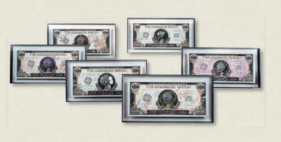 " 在 ADAMASH 世界中流通的货币被称作 AMA 币,并参考现实世界流通货币的基本形象,以 Ada 的头像作为中心,嵌入阿尔法,Ada 印章,以及带有设计师名字的词句等关键元素。Ada 世界货币的名称源自于ADAMASH 中间的 AMA;符号元素采用了 logo 中 M 设计的简单变形;设计师还为 AMA 币设计了一个简单的印章:两束橄榄枝包裹着 Ada 的简笔头像,并附上了 AMA 币名称 ,通体采用象征和平的绿色。此版画限量 99 版,其中第 1-20 版为艺术家二次创作版,每版仅此一个。此次上拍的一组 6 张为1/99,2/99,3/99,6/99,7/99,13/99。"