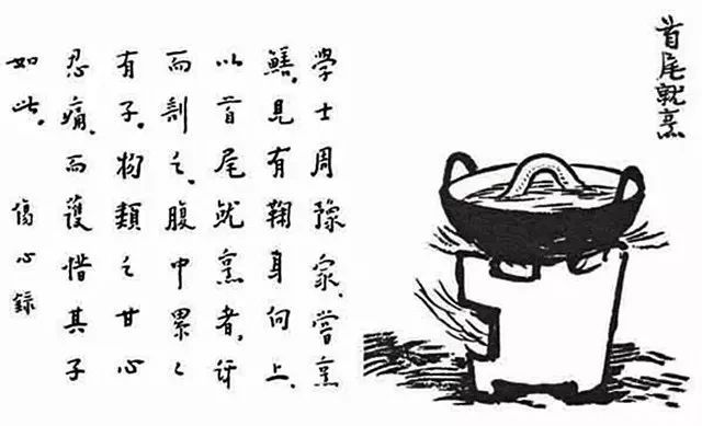 “首尾就烹”画的是一条怀孕的鳝鱼被烹煮时,弓起腹部保护幼鳝的情景