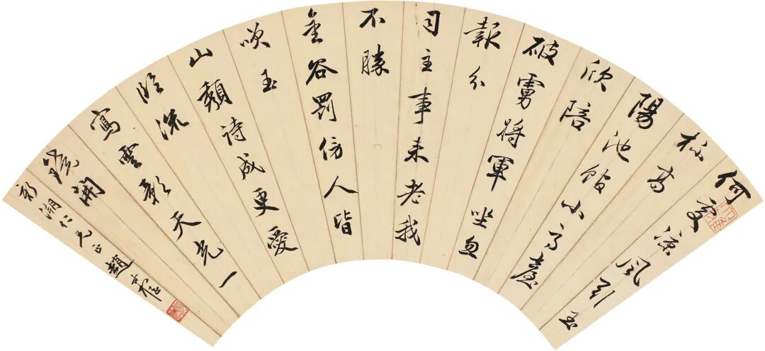 释文:何处凉风引玉标,高阳池馆小高台。欣陪破虏将军坐,忽报分司主事来。老我不胜金谷罚,傍人皆笑玉山頺。诗成更爱临流写,云影天光一镜开。