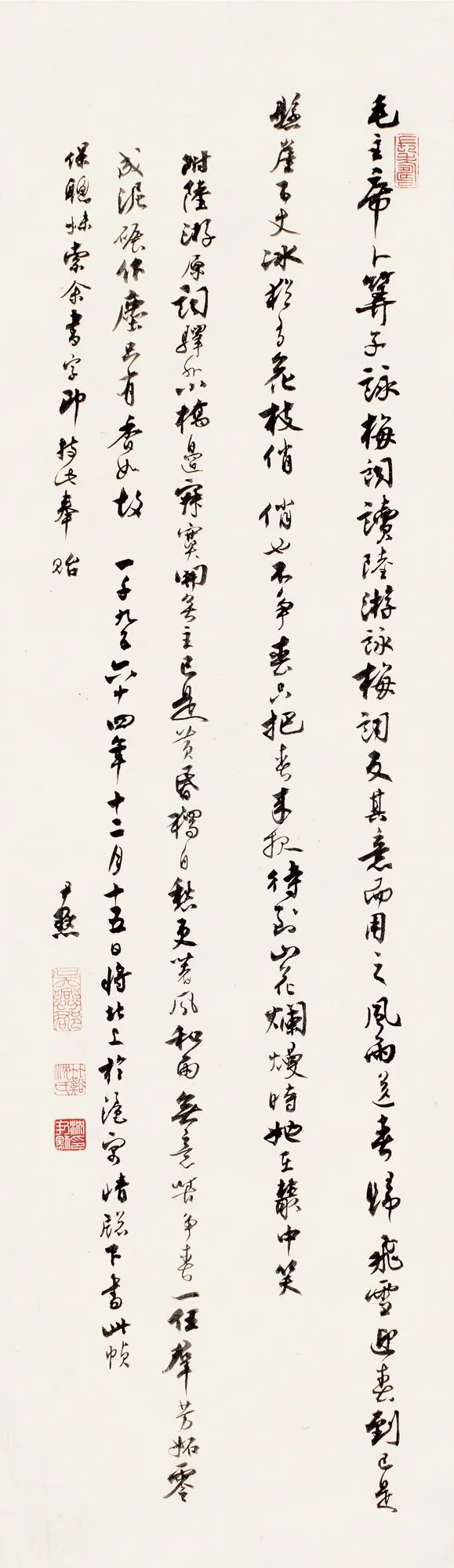 题识:一千九百六十四年十二月十五日将北上,于沪寓晴窗下书此帧。保聪妹索余书字,即持此奉贻,尹默。