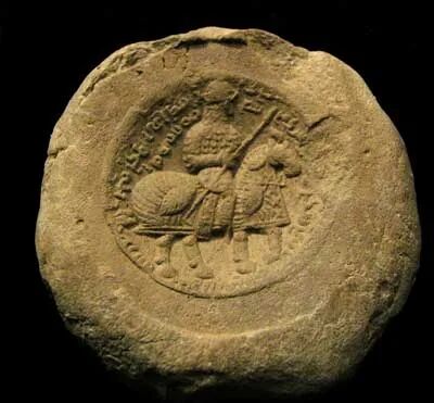 笔者的观点,正经表现武官或者武士形象的只有这种“将军印”,而且这类印章没有实物存世。所以大家就看看封泥吧,笔者特地找了件比较清晰的(可惜不是弯月的藏品)。可以看到连人带马全副武装的“骑士”,头盔应该是开合式的,周缘还垂有锁链甲。