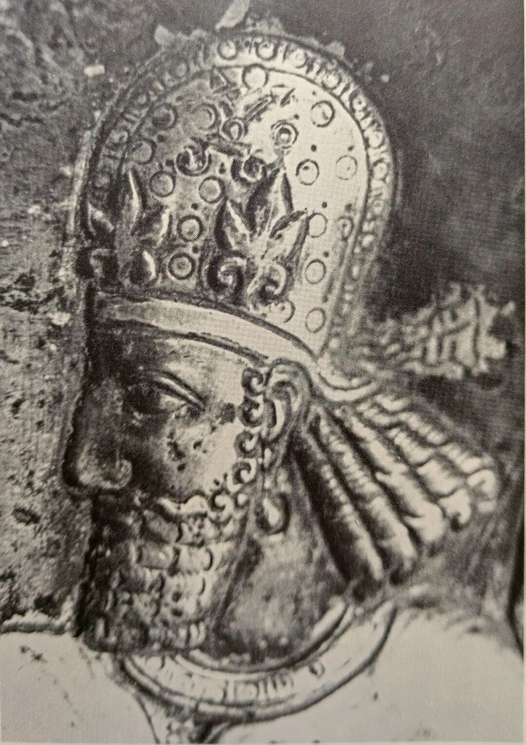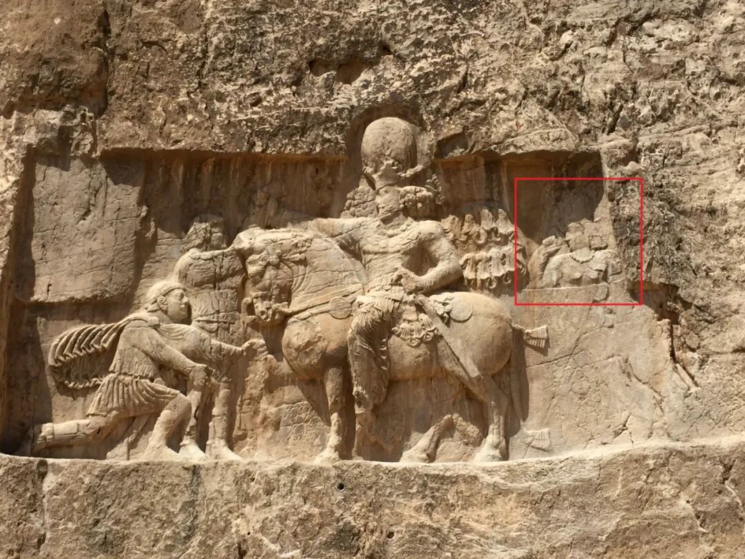 “冕”就是帽子,其中最常见的是一种半椭圆形的高帽,被称为kulah,几乎是高级贵族的标配。萨珊波斯早期的五朝元老、马兹达教正统的奠基人、穆贝德中的穆贝德(最高级的马兹达教祭司)、国师克底尔(Kedir)就喜欢戴这种帽子。比如他在沙普尔一世(他辅佐的第一位萨珊国王)的摩崖石刻旁就给自己加了个戴kulah的头像。