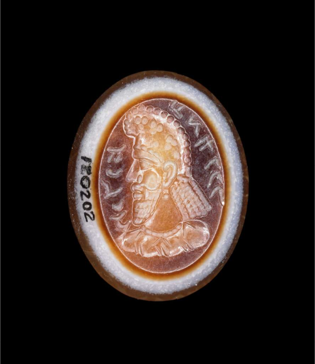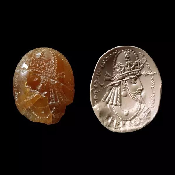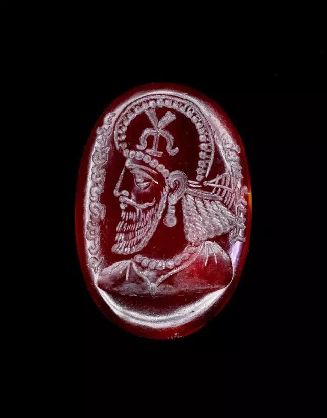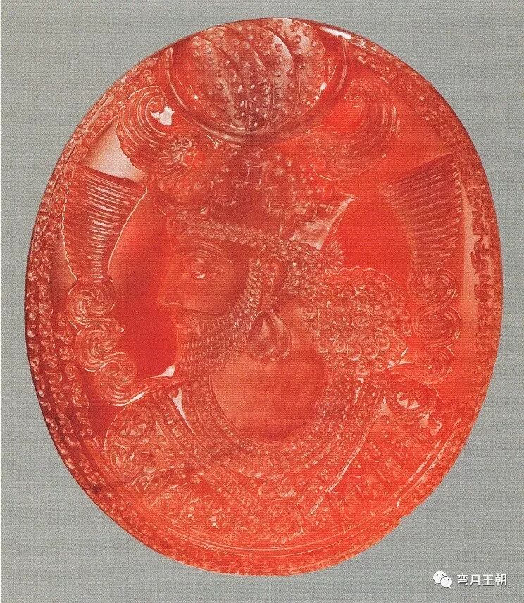 以下将萨珊印章上的人物头饰分类介绍,并展示浮雕、银器等大型艺术品上的对照例子。