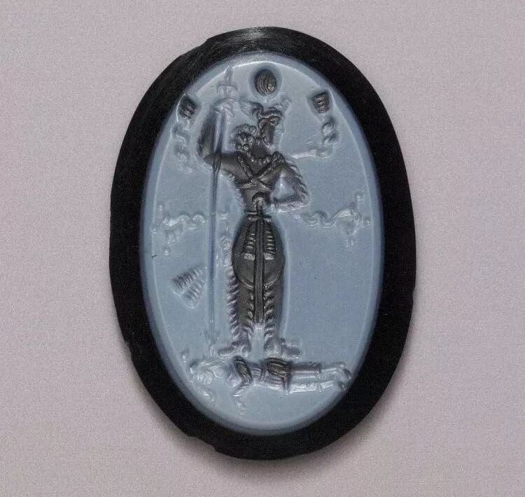 在大部分半球形萨珊印上,贵族头饰都是简化的版本,且绝大部分有冕无冠。椭圆高帽通常被描绘为一个简单的半球,像半个鸡蛋壳扣在脑袋上,所以很容易被当成头盔。但实际上在表现武士争斗的题材中,可以看到盘发(下一篇会介绍)是更常见的。当然这不是说波斯士兵都配不起头盔,在将军印上(见下文)重甲骑士的头盔是很漂亮的。