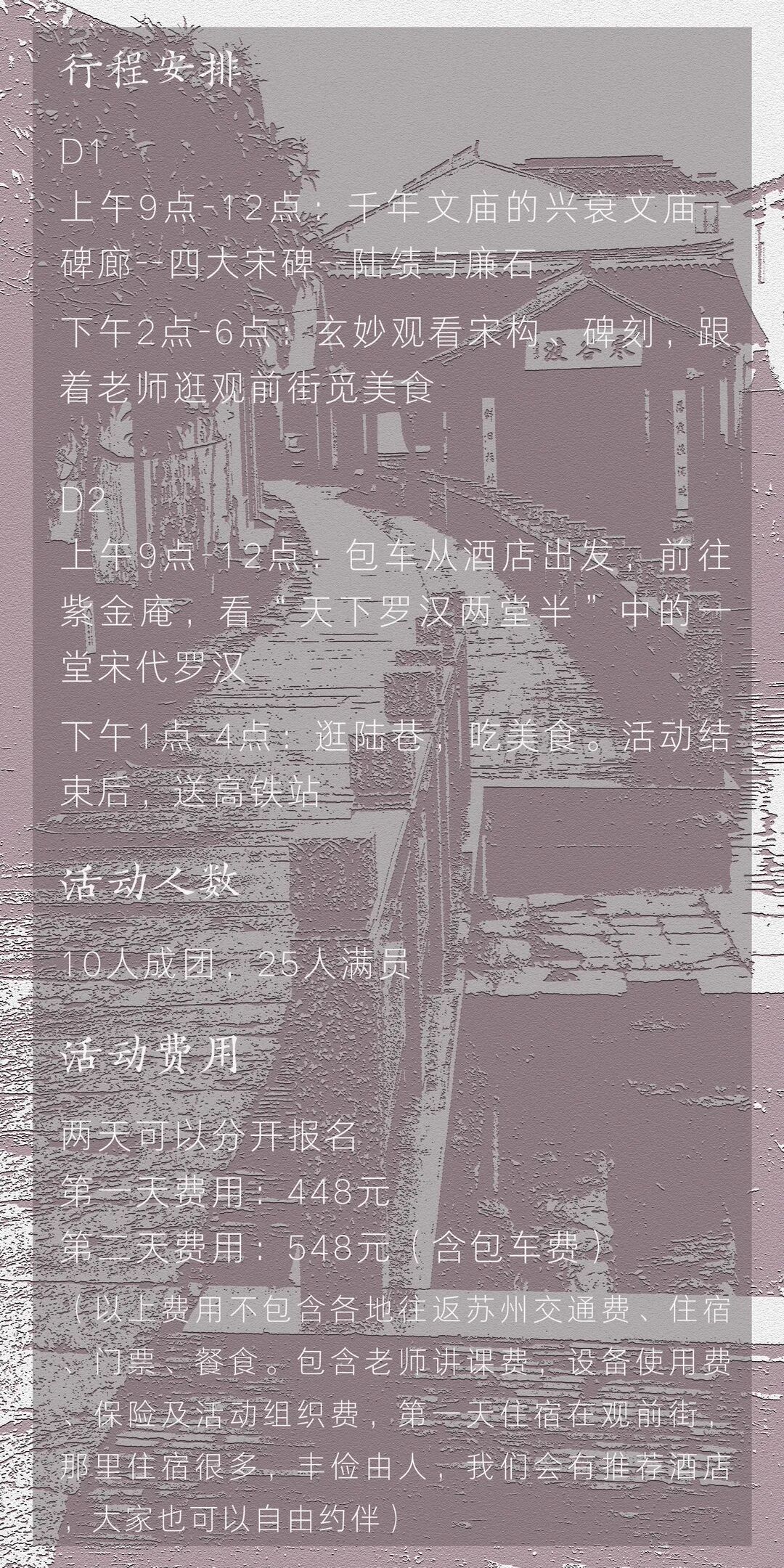 苏州最为人们所熟知的恐怕是“河上桥影、两岸笙歌”的水乡以及精致典雅的园林。不过,作为有近2500年历史的文化名城,苏州的优美和底蕴远不止这些。2022年元旦,我们将组织一场“苏州寻宋”活动,避开拥挤的人流,走一条连苏州人都不一定熟悉的小众路线,在千年之后寻找遗落在江南的宋朝风韵。我们的旅程将从苏州文庙府学开始,馆内的“天文图”,“地理图”,“帝王绍运图”和“平江图”碑,简称为“天,地,人,城”四大宋碑,均为南宋刻石。接着将前往闻名遐迩的玄妙观,走进至今依然保留着宋代宗教厅堂建筑的三清殿,细细品味宋代建筑和碑刻的妙处。天下罗汉两堂半,吴中独占一堂半。这一堂就是我们的第三站——紫金庵。庵里南宋年间的十六罗汉,形态各异,栩栩如生,有着世间人情,又超然于尘世之外。南京的门东门西、高淳的老街,想必大家都很熟悉。但是较之苏州的陆巷,在完整程度上就逊色多了。这里保留着明代建筑数十处,清代建筑则比比皆是,肯定会让你流连忘返。看宋碑,赏宋构,访宋塑,还要一路打卡苏州各种美食,这场悦目怡心的姑苏之旅,是元旦假期我们送给大家最好的文化大餐。长山苏州大学毕业,吴文化爱好者研究者。痴迷于传统文化,园林、昆曲、吟诵等。跟随诸多苏州地方学者专家,如魏嘉瓒、沈亮、马韫君、尢梅俊等先生系统学习苏州文化。精读大量苏州地方史志典籍,走访了苏州大大小小的山水、街巷、古建等历史遗迹。苏州文庙府学是北宋名臣范仲淹于景祐二年(1035年)创建的,迄今已有980多年历史。范仲淹出任苏州知州的次年,在南园遗址上,设学立庙,庙学合一。范仲淹聘请当时著名教育家胡瑗为教授,因为办学有方,一时名闻天下,成为各地州,县学效仿的楷模。此后历经拓建,有江南学府之冠的赞誉。现被用作苏州市碑刻博物馆,馆内的“天文图”,“地理图”,“帝王绍运图”和“平江图”碑,简称为“天,地,人,城”四大宋碑,均为南宋刻石。四大宋碑是我国科技史和世界科技史上的杰作。其中《天文图》碑是世界上最古老的石刻天文图之一,在天文学史上占有极其重要的地位。《地理图》碑为宋代中国政治地理图,是我国现存最古老的石刻地图之一,在地理学史上具有很高的价值。《帝王绍运图》碑则是我国古代唯一的石刻帝王世系图,是研究中国古代政治史的重要史料。《平江图》碑为宋代苏州市平面图,是现今世界上最古老的石刻城市地理图,也是研究古代城市规划不可多得的实物资料。这四块宋碑1961年被国务院列为国家一级重点保护文物单位。玄妙观,位于苏州市观前街,创建于西晋咸宁二年(公元276年),玄妙观极盛时有殿宇30 余座,是西晋时期最大的道观。南宋淳熙六年(1179年)重建的主殿三清殿面阔9间,进深6间,高约30米,建筑面积1125平方米,重檐歇山,巍峨壮丽,是江南一带现存最大的宋代木构建筑。观内保存有大量各朝古碑,其中有老君像石刻,为唐吴道子绘像, 唐玄宗题赞,颜真卿书,由宋代刻石高手张允迪摹刻,可称“四绝”碑,是国内仅存的两块老子像碑之一。紫金庵,坐落在洞庭东山西卯坞内,始创于唐代,清代重修。主要建筑虽仅为一殿一堂,但它因有南宋民间雕塑名手雷潮夫妇塑的“精神超忽,呼之欲活”的罗汉像而声名远扬。陆巷是苏州吴中东山镇的一个小村子,以风景秀丽而出名。位于太湖边,背山面湖,是一座明清厅堂建筑保存较为完好的古村落。现尚保留着明代建筑数十处,清代建筑则比比皆是。面积达上万平方米。规模如此庞大,保存如此完好的古村落在江南一带实属罕见。陆巷因村中有六条直达太湖的巷弄而得名。(以上费用不包括各地往返苏州的交通、住宿、门票、餐食)(包括老师讲课费、设备使用费、保险及活动组织费,第一天住宿在观前街,哪里住宿多,丰简由人,我们会推荐酒店,大家也可以自由约伴)