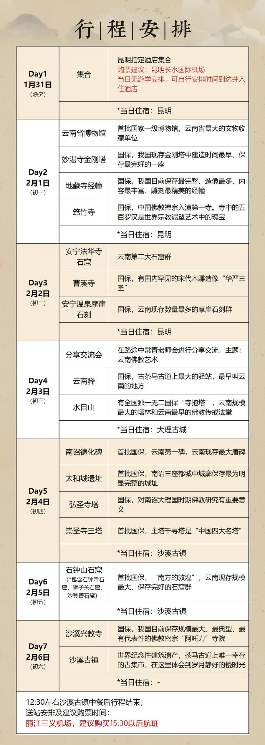 博物馆的藏品最具特色的是南诏与大理国时期的佛教文物,滇文化青铜器,以及近现代多姿多彩的少数民族文物精品。其中有大理国银鎏金镶珠金翅鸟、大理国金阿嵯耶观音立像、战国时期的牛虎铜案、西汉战争场面叠鼓贮贝器、西汉四牛鎏金骑士铜贮贝器等是镇馆之宝。国保,我国现存金刚塔中建造时间最早、保存最完好的一座。又名“穿心塔”,我国现存年代最久的一处砂石构筑的典型喇嘛式佛塔。国保,我国目前保存最完整、造像最多、内容最丰富、雕刻最精美的经幢,被誉为“滇中艺术之极品”,有“东方佛教绝世稀有之艺术”之美誉。它是研究大理国时期云南佛教艺术的珍贵实物资料,代表南诏大理国时期云南佛教艺术的卓越成就。国保,中国佛教禅宗入滇第一寺。寺中的五百罗汉造像被称为““东方雕塑像艺术宝库中一颗璀璨的明珠”,摆脱了其他寺院五百罗汉正襟危坐、千人一面的刻板模式,是 中国佛教造像中独具特色的精品,也是世界宗教泥塑艺术中的瑰宝。云南第二大石窟群,首批省保。建于宋代,我国古代少数民族地区为数不多的石窟艺术之一,这里还有明朝嘉靖年间拓刻的禹王碑,具有珍贵的文物价值。国保,千年古刹,建于宋代大理国时期,这里有国内罕见的宋代木雕造像“华严三圣”,闻名天下的“天涵宝月”奇观,被誉为“活文物”的众多奇花古树,宋元建筑风格的大殿,还有一块被誉为“三绝碑”的《重修曹溪寺记》。国保,云南省现存数量最多的摩崖石刻群,题书多出自明、清和民国时期军政要员和社会名流之手。在前往云南驿和水目山的途中,常青老师将给大家分享云南的佛教艺术。国保,我国首批传统村落,古茶马古道上最大的驿站,“彩云之南”的故里,也是最早叫云南的地方。如今是唯一集中了马帮运输、公路运输、铁路运输与航空运输等运输方式的地方,是人类交通发展史的活化石。云南著名佛教圣地,被誉为“大理国皇家林园”。这里有全国独一无二的国保“寺抱塔”—水目寺塔,云南规模最大、全国名列前茅的塔林—北岗塔林和云南最早的佛教传戒法堂等。首批国保,云南省现存最大唐碑,被誉为“云南第一碑”。记述了南诏在唐王朝的扶植下统一六诏、合并两爨、叛唐附吐蕃和统一云南的具体经过,是研究唐史特别是南诏史的第一手资料。《蒙国大诏纪功碑》碑亭,此碑现称南诏德化碑 图源/渔夫首批国保,南诏国建立后的第一座都城,南诏三座都城中城廓保存最为明显完整的城址。国保,是历史上南诏国、大理国的都城羊苴咩城遗址的重要组成部分,整体造型庄严优美,虽经历代修缮,却仍保有唐宋时期风格,对南诏大理国时期佛教研究具有重要意义。因为此塔并未开放,我们将远观并听老师讲解。首批国保,主塔千寻塔是“中国四大名塔”,大理的文化地标,云南现存最古老的建筑物之一。它是大理国时期是皇家的寺院,大理历史上规模最为宏大的古刹,是一组唐宋的群塔,三塔汇聚宗教文化、建筑文化、历史文化和民俗文化,具有极高的历史、文化、建筑价值。