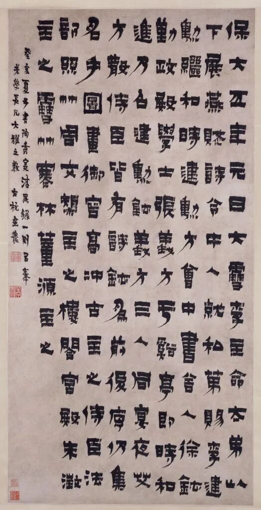 金农的书法独创扁笔书体,兼有楷、隶体势,时称“漆书”,非常容易辨认。许多买主也就只认他的书法,而看不出或不在意金农本人与代笔者在绘画上的差异。