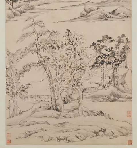 明·赵左《秋山红树图》台北“故宫博物院”。左上角有董氏题曰:“峒关蒲雪,杨升妙迹不多传,见此如虎贲中郎”。可见他对赵左的欣赏。