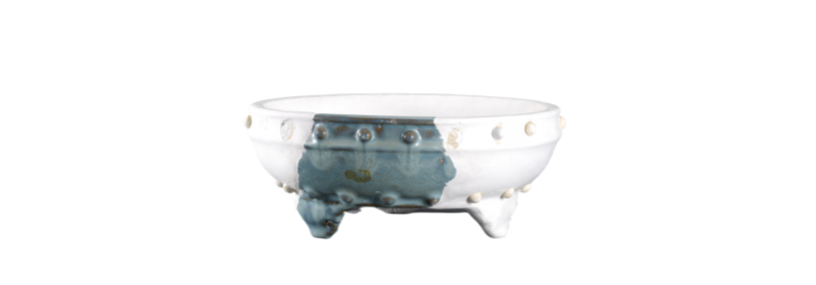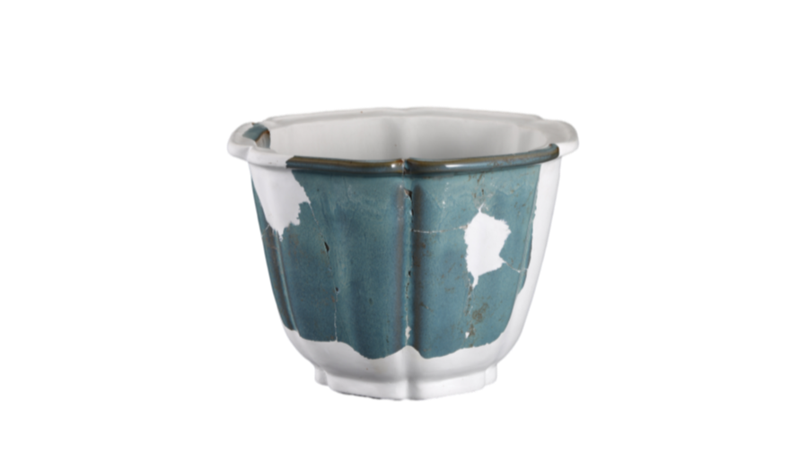 此“官钧”花盆托系河南钧州窑为朝廷烧造。“官钧”花器底部、足部内侧多刻或印有从一到十的数目,用以标识大小和花盆与盆托配对之用。数字越小器物越大。此器底部刻有“六”字铭款,表明其属中等偏小的器物。
