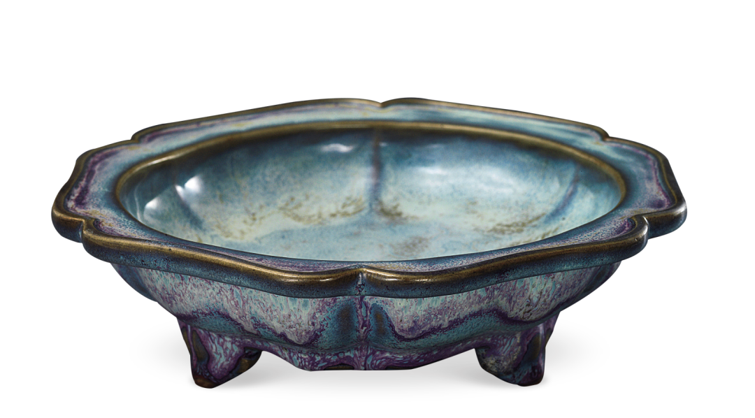 这类器物早年学者多定为北宋钧瓷三足洗,实为明代莳养菖蒲花盆的盆托,明人文献称“水底”,其上配置对应数目刻款的花盆。