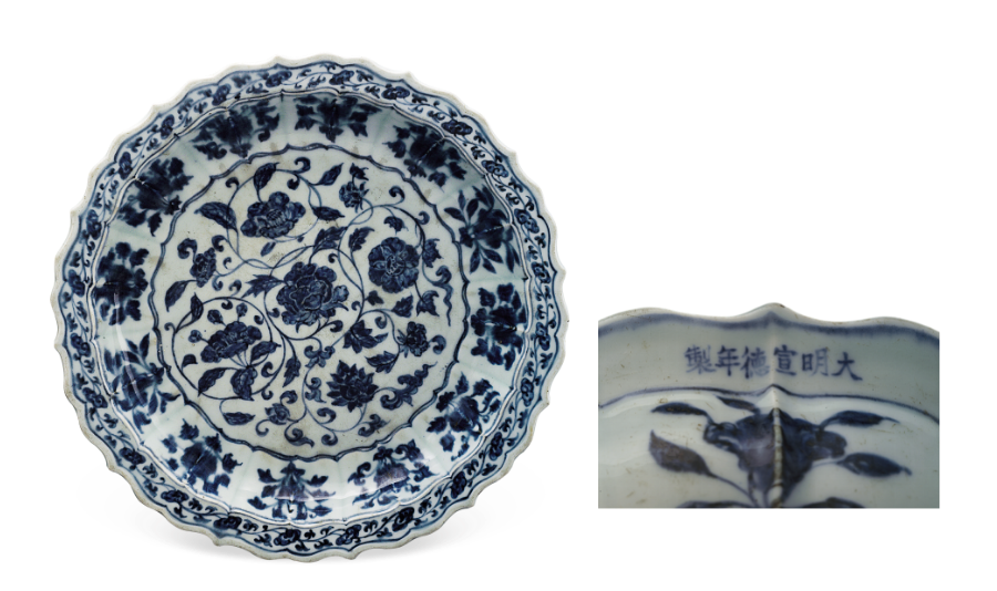 此盘呈十二瓣菱花式,盘内青花纹饰分三层,折沿绘一周缠枝灵芝纹,盘心绘五朵缠枝花卉,牡丹居中,四周辅以山茶、栀子花、莲花、芙蓉,内外腹壁每一棱皆绘一组折枝花卉,内外壁对称共绘六组栀子花、牵牛花、莲花、山茶、牡丹、菊花。外口板沿下青花书“大明宣德年制”款。