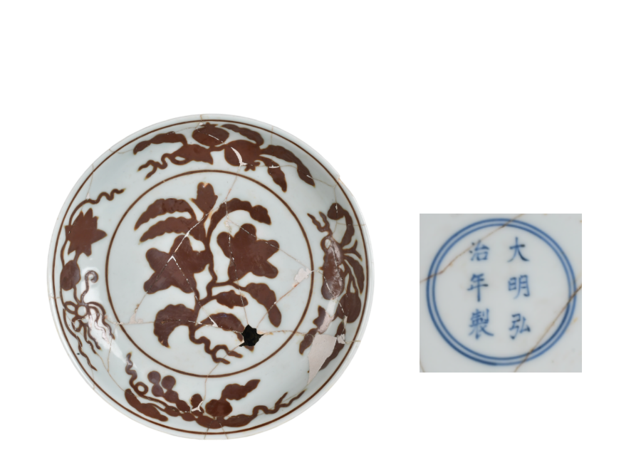 此盘中心饰折枝花一枝,内壁装饰石榴、柿子、葡萄、荷花等四种折枝果,外壁则饰缠枝茶花纹,纹饰皆先线刻后,再上紫金釉。此类作品延续宣德官窑之稿样,亦有黄釉和青花作品。底中心书青花“大明弘治年制”款。