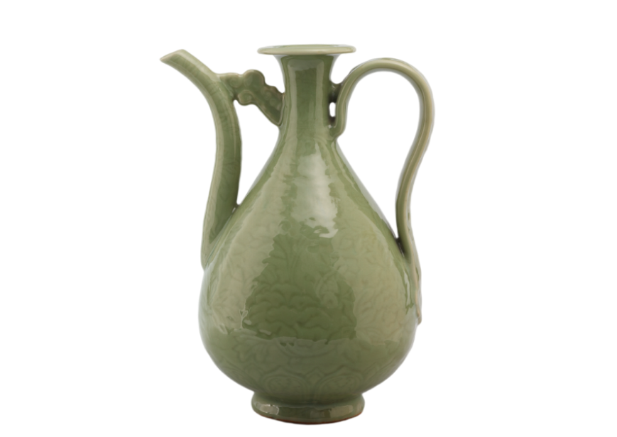 此酒注器身呈玉壶春式,通体施青釉,釉色碧绿莹亮,刻花严谨工整,属于明初宫廷订烧的处州官样器物。安徽合肥西郊永乐十二年(1414年)陈闻墓出土龙泉刻花玉壶春瓶,造型纹样与此件类似。《明太宗文皇帝实录》载永乐二年琉球国“山南使臣私赍白金诣处州市磁器”。