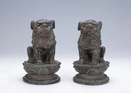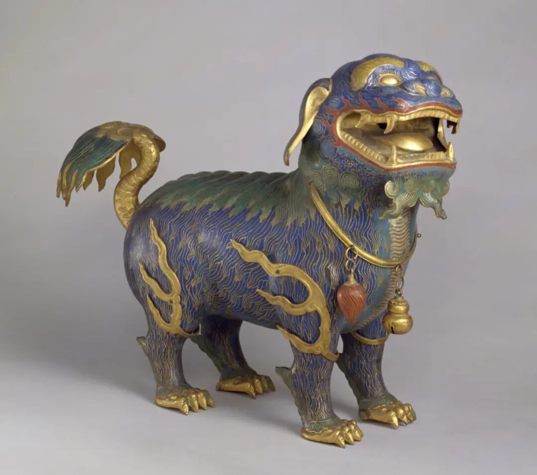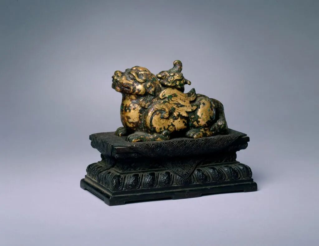 程式化特征更强,墓道守卫狮、守门狮,都是雌雄成对的,雌狮都伴有小狮。精神状态方面更趋向于衰靡,如帝王陵墓前的守卫狮子仪而不卫,狮子仅仅成为摆设。雕刻手法也达到成熟的程式化的阶段,卷毛、铃铛雕饰细膩而丰富,眼、口、鼻、尾的细部刻画精微不苟。如故宫内的一对铁狮,虽然仍呈蹲坐式,但身体已趋下趴之势。头部特大,其宽度超过胸和双肩的总和,胸窄而内收,四肢短小,头顶肌肉如疙瘩,卷毛呈高突螺旋状,嘴扁平并有彩带缠绕, . - -小狮伏于身上,一小狮被踩于脚下作龟缩状。雕刻虽精细,但繁琐有余气势不足。造型偏重细节,整体感不强,神态上趋向喜乐。至清后期,大多数造型都较繁琐,不顾整体,甚至粗糙不堪、造型丑陋。繁琐的纹饰只能说明造型理想的萎靡和审美趣味的俗化,自宋以来日益衰竭的国力正是这种人文精神的根源。