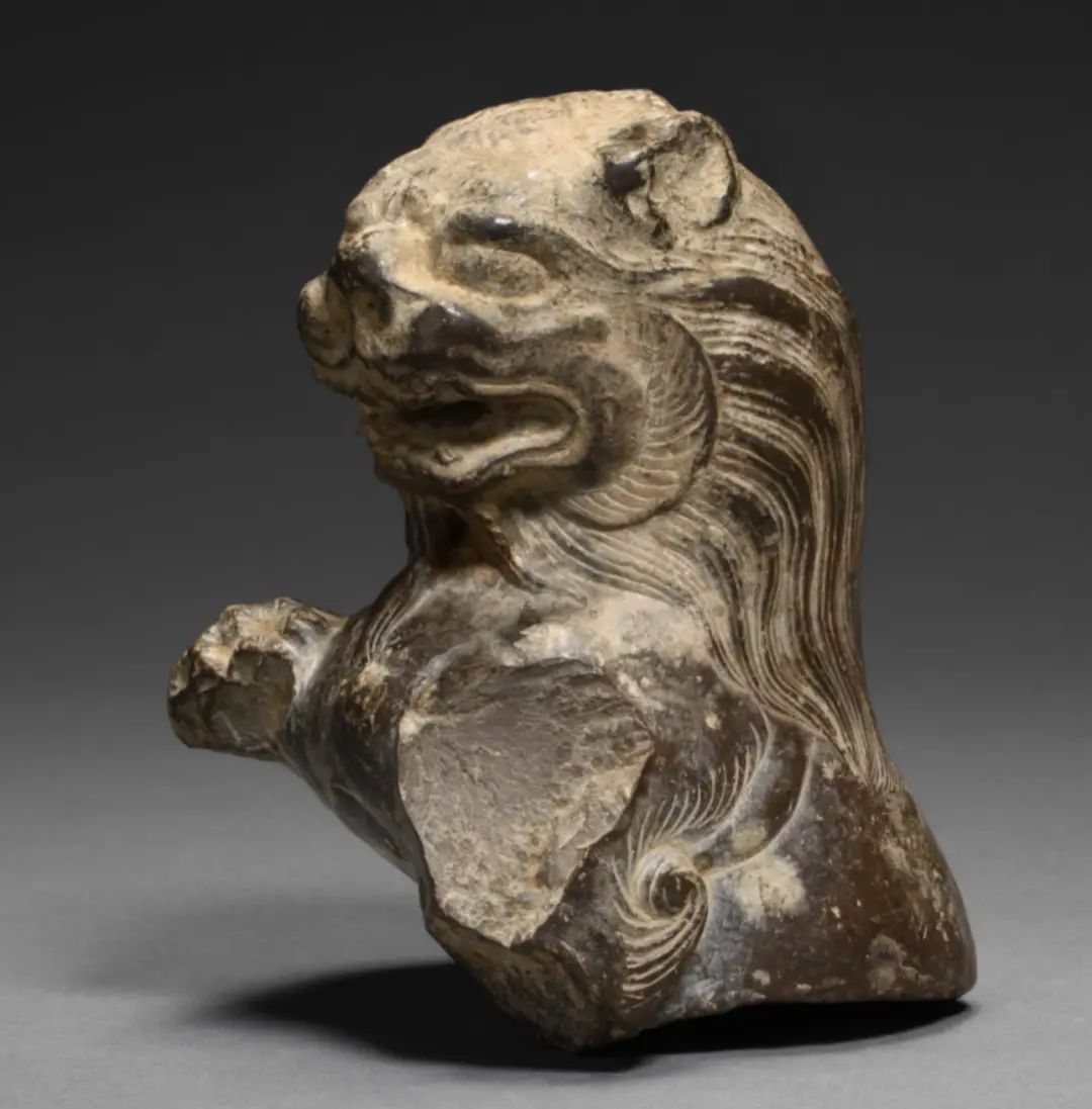 汉代狮子造型为虎头狮身,昂首阔步,庄严威武,矫健刚劲,敦厚沉实,有强烈的感染力。从侧面看脊柱动态呈S线,狮子显得矫健而充满跃动之势;装饰手法多样,以圆雕、浮雕及线、面、体相结合的手法雕凿鬣毛、颌须及身躯上的卷云纹、火焰纹等。