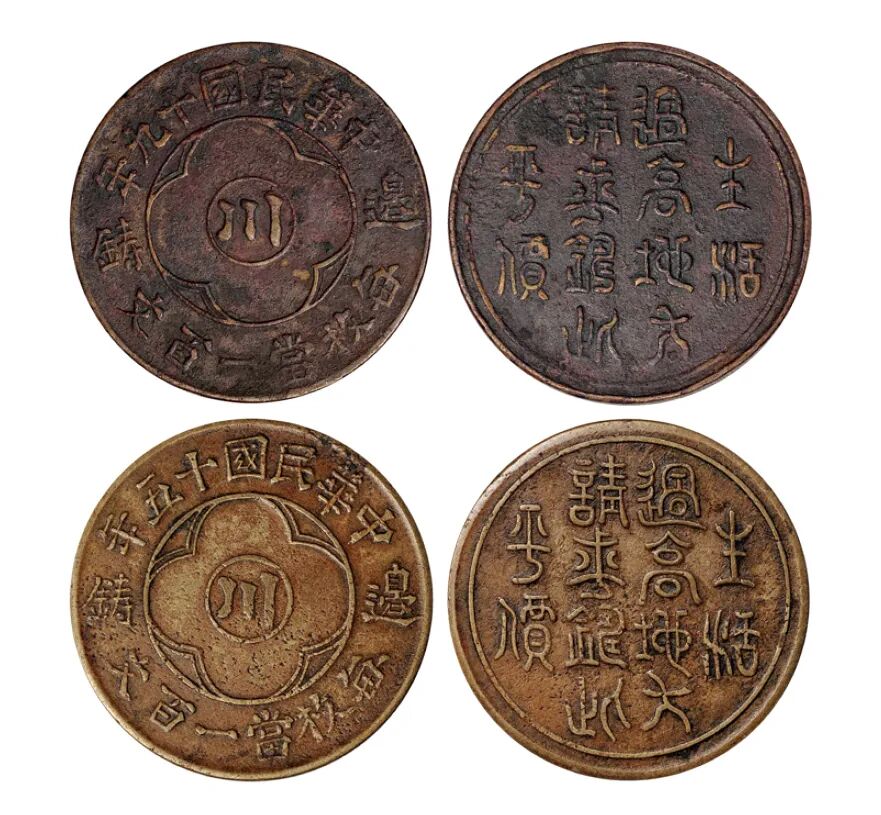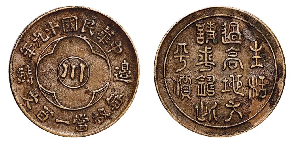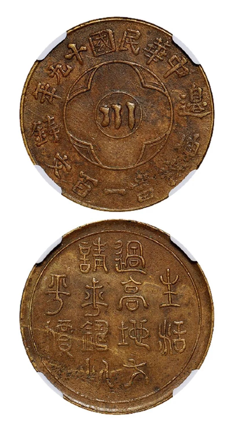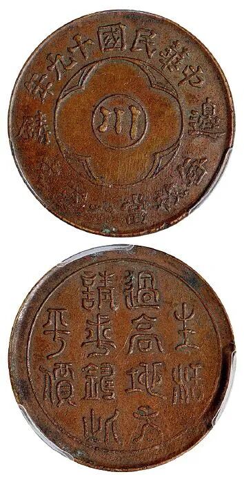 简介:民国十五、十九年四川省造中心“川”字边铸一百文铜币各一枚,CL-SCJ.53、57,背铸“生活过高地方请求铸此平价”,极美品