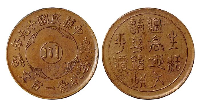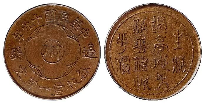 民国十九年四川省造中心“川”字边铸一百文铜币2枚