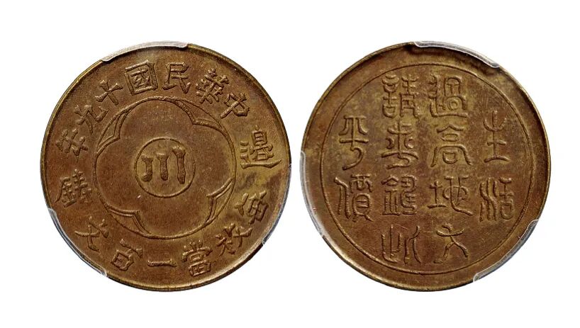 民国十九年四川省造中心“川”边铸一百文黄铜币/PCGS XF45