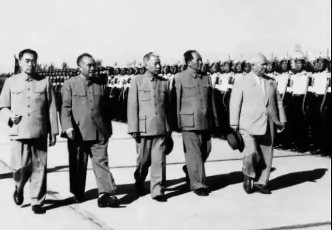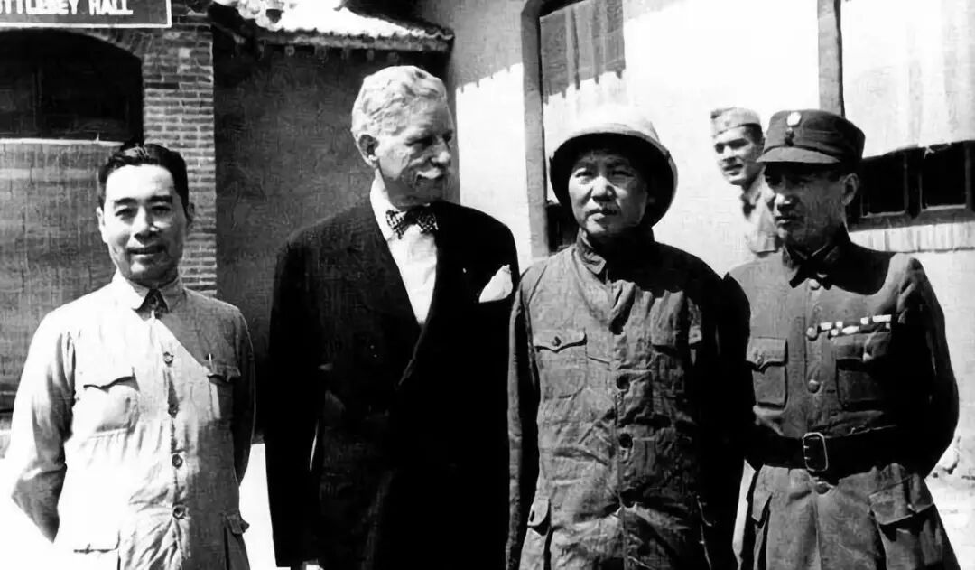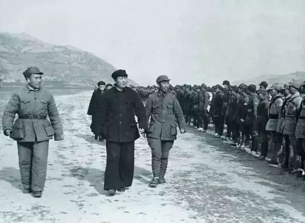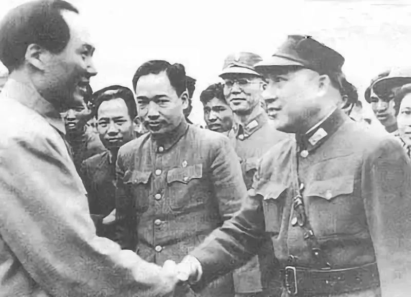 1943年毛泽东与周恩来、朱德、彭德怀等到八路军炮兵团视察。1944年,毛泽东、彭德怀在延安与美国军事人员合影。彭德怀战功赫赫,毛泽东曾写诗赞扬彭德怀:山高路远坑深,大军纵横驰奔。谁敢横刀立马?唯我彭大将军!△中共七大上,毛泽东与朱德