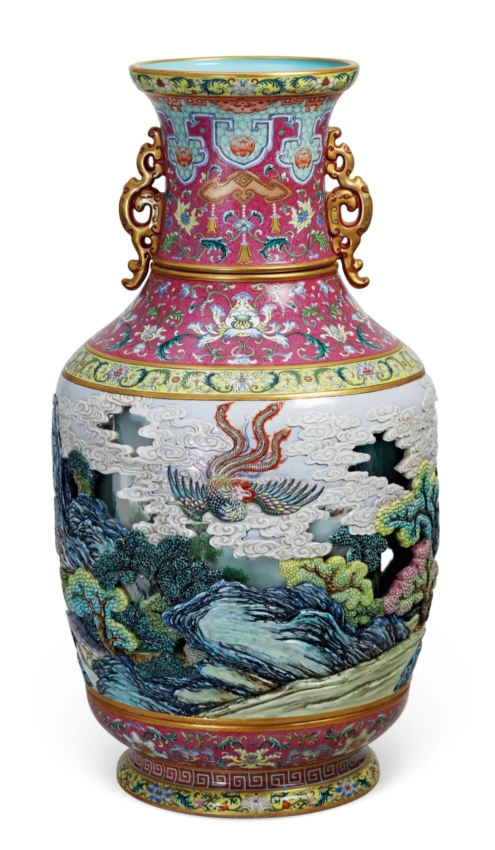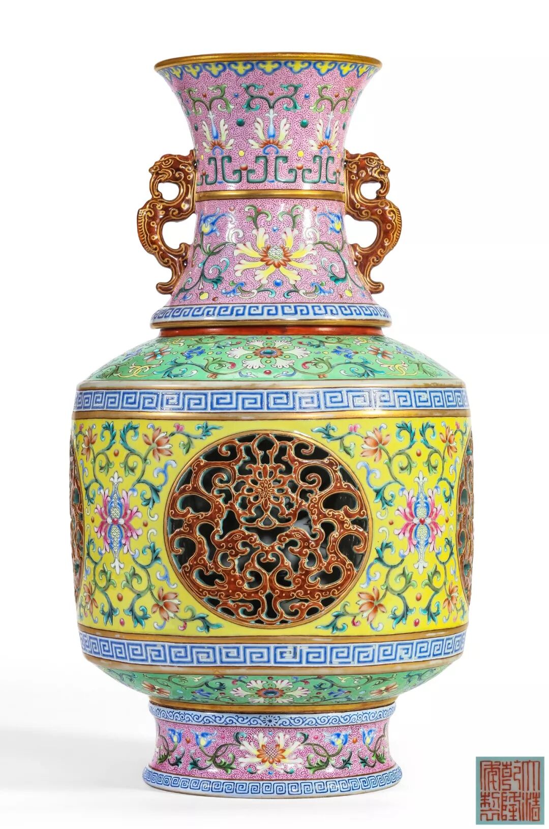 相信玩儿瓷的朋友们都听过一句行话——“瓷器要玩清三代”,而“清三代”之中,乾隆朝更以其登峰造极的技术独领风骚,堪称中国彩瓷历史的巅峰时代。镂空转心瓶、转颈瓶,器型硕大,烧造工艺极为复杂,对窑炉、胎土甚至天气都有着近乎“苛刻”的要求,而镂空加旋转,在技术上的难度是现代人即使掌握也难以做到位的,是乾隆官窑的杰作。拍场中之所以会出现许多冲上千万,乃至上亿的乾隆大器,便是因其数量稀少、烧制难成,可以说乾隆大器繁复瑰丽的艺术表现,已成为近年国内艺术品收藏的典范!