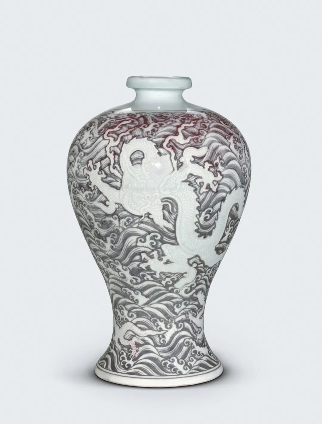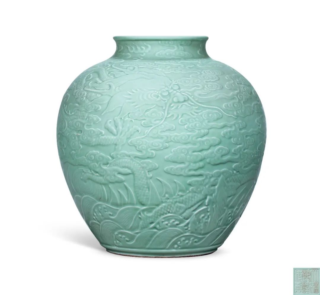 每季瓷器版块的拍场成交中,价格超千万元的瓷珍都是占比极少的,本季秋拍成交千万元以上的瓷器多达31件,较春拍时的22件实现了稳步增长。除却“千万级”的重磅拍品,各拍行精挑细选的佳瓷在拍场中也是人气火热,竞价此起彼伏,不少瓷器都以数倍、数十倍的高溢价成交!从品类上看,本季的成交TOP榜可是精彩纷呈,涵盖了釉里红、单色釉、青花、清代彩瓷,可谓看点十足。首先赚足眼球的是TOP榜上两件成交超5000万的“苍龙教子图”纹瓷器,一件中国嘉德拍出的明永乐 釉里红海水锥拱苍龙教子图大梅瓶,成交价7475万人民币;另一件香港保利拍出的粉青釉浮雕「苍龙教子」图大罐,成交价为5280万港币,这两件重器分列当季瓷器成交的第2、3名,战绩斐然。永乐时期,景德镇御窑生产在前朝的基础上取得了空前的发展,开创了明清御窑制瓷业的第一个高峰,而明皇室对朱红的专有权,催生了釉里红瓷的大量烧造,但高温釉下的铜红呈色非常不稳定,不仅烧制难度大,且成品率低。在陶瓷古籍文献中,把青花、釉里红和高温色釉瓷统称为“窑彩”,更是有着“千窑一宝”之称,因此,传世永乐御窑釉里红瓷器可是尤为珍贵,如今秋这件 明永乐 釉里红海水锥拱苍龙教子图大梅瓶,与之相同的存世之作仅有2例,存世之罕,堪称传奇。来自亚洲显赫私人收藏的 粉青釉浮雕「苍龙教子」图大罐 为雍正晚期至乾隆间单色釉作品中的巅峰之作,最终以5280万港元夺得本季香港2021秋拍中最高价的瓷器。单色釉,又被称为瓷器中的“大家闺秀”,是一种除自身釉色外不假其他色彩装饰的瓷器,可以说不浮、不嚣、不靡、不媚是它的独有气质,它诠释着高阶的审美,和跨越年代的极简美学,其作为最早出现的釉色品种,在相当长的历史时期内都占据着瓷器生产的主流地位,本季秋拍也不乏高价成交的单色釉精品,下面就众藏友列举一二。高 26.1 cm![]()