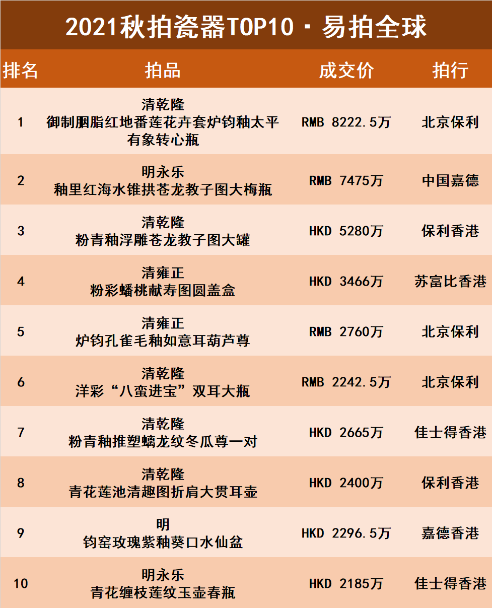 2021秋拍战场可谓风起云涌,以苏富比、佳士得、嘉德、保利为代表的行业巨头酣战竞逐,亮眼的成绩和频现的重磅成交“名场面”火爆了整个拍卖市场!就目前瓷器版块的成交结果来说,已涌现出31件成交过千万的瓷器精品,其中清三代19件,明代9件,宋元3件,本期我们将聚焦秋拍瓷器版块中的成交TOP10,为藏友们逐一呈现其亮眼表现!感兴趣的朋友戳这里![]()