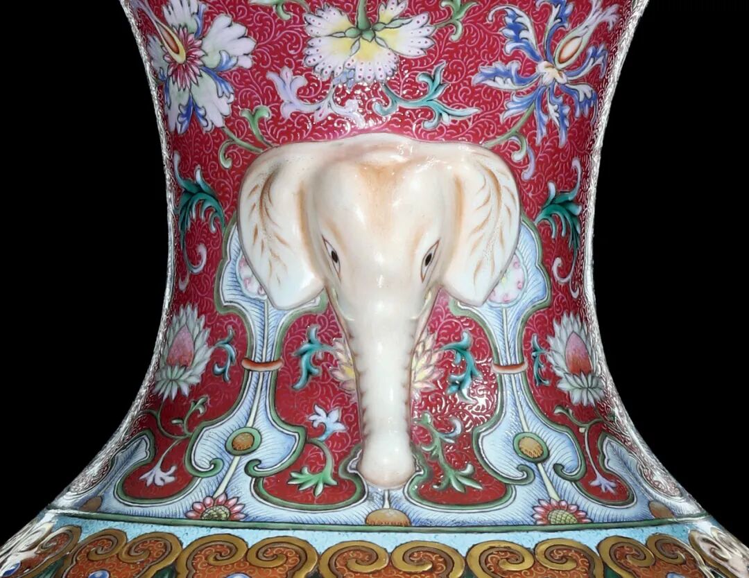 △清乾隆 御制胭脂红地番莲花卉套炉钧釉太平有象转心瓶