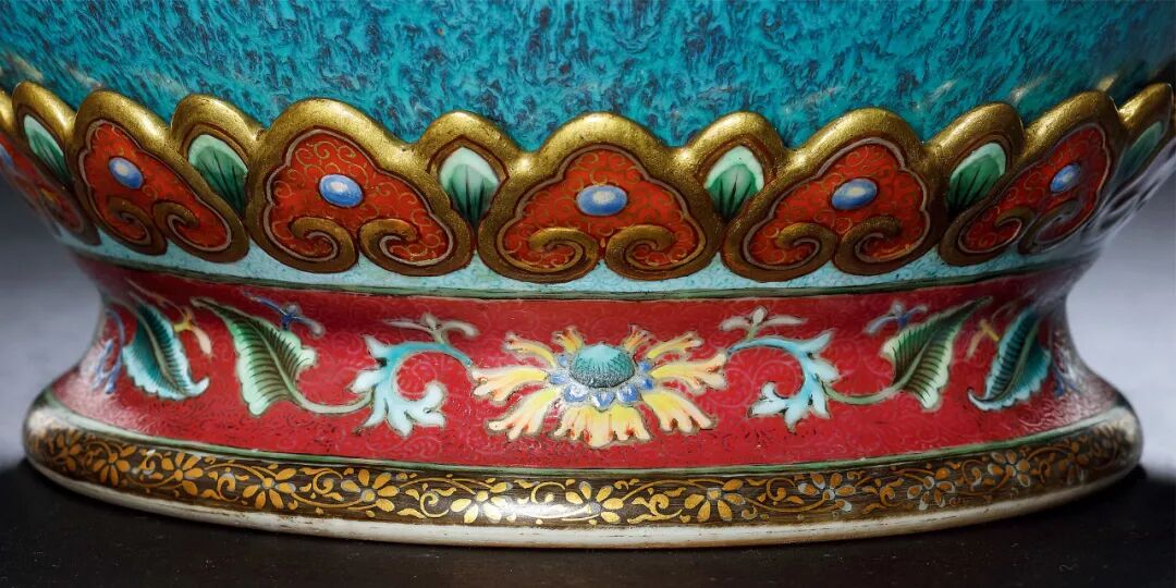 △清乾隆 御制胭脂红地番莲花卉套炉钧釉太平有象转心瓶存世的转心瓶之中,大多是满布洋彩、粉彩装饰的,以单色釉相配的不过几件,这件瓷器腹部主体以炉钧釉为饰,设计罕见,可谓凤毛麟角!