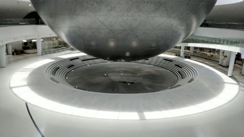 球幕影院下的夏至日光环图源/上海天文馆圆洞天窗、球幕影院、倒转穹顶呈“三体”结构,而螺旋形态犹如“天体运行轨道”,独特的建筑不仅展现着天文,也记录着天文。