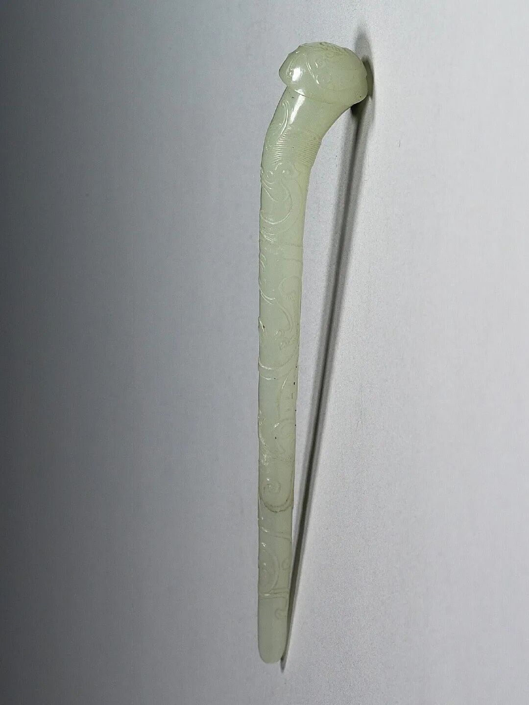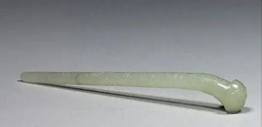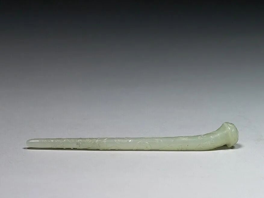 长12.6cm、高1.2cm。清亮光润的白玉,作成发簪。簪浅浮雕螭龙,簪身阴线刻篆书“子刚”二字。