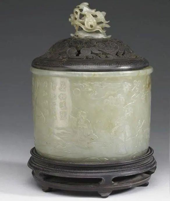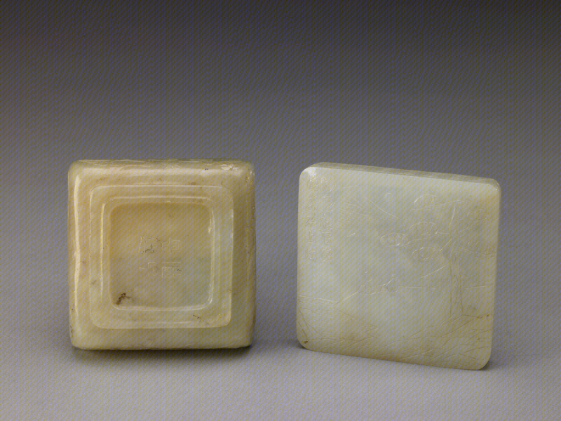 通座高9cm、盒高6.2cm、口径7.8cm、底径6cm。青白玉,玉质温润。盒盖子母口,盖上以浅浮雕及阴线刻的手法雕琢山水人物。远山近水,一棵垂柳下坐两人,对坐交谈,远处渔舟,一人在船头垂钓,另有茅屋、山人,俨若山水画页,一边浮雕诗句:“桃红含宿雨,柳绿带朝烟”。盒身及盖四壁以过枝技法浅浮雕秋葵、荷花、石榴、桃花,代表一年四季。盒底方框内,减地浮雕“子冈”两字。