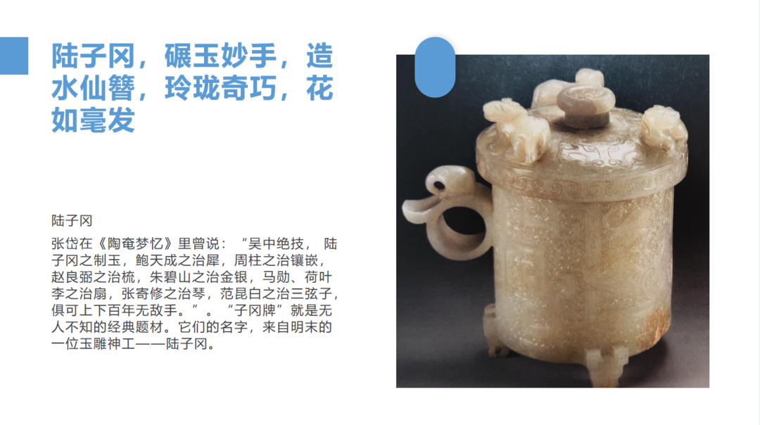 陆子冈生活于明嘉靖、万历年间,原籍太仓,后迁居苏州开办琢玉作坊。其琢玉技艺高超绝伦,可谓巧夺天工。闻名于世的“子冈牌”便是因他而得名,其内容通常是一面琢文人山水画,另一面琢诗文印章,高雅脱俗。