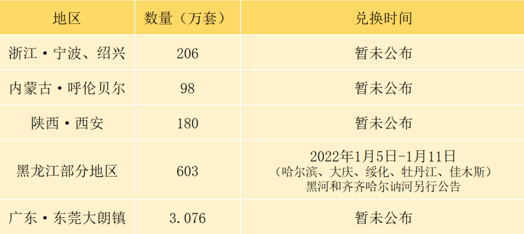 另外还有大约一千万套冬奥钞,因为疫情防控延迟兑换,目前只有黑龙江部分地区公告了兑换时间,其他地区暂未公布。