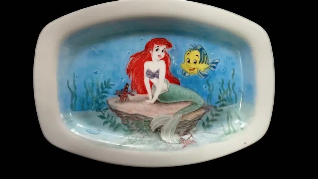 小蔓先来到中国轻工业陶瓷研究所,在研学基地开始陶瓷釉上的绘画,当时画了两件瓷器:一件 “美人鱼”是为家里小朋友画的礼品(图1),另一件是“陶瓷山水”瓷盘(图2~图3)。