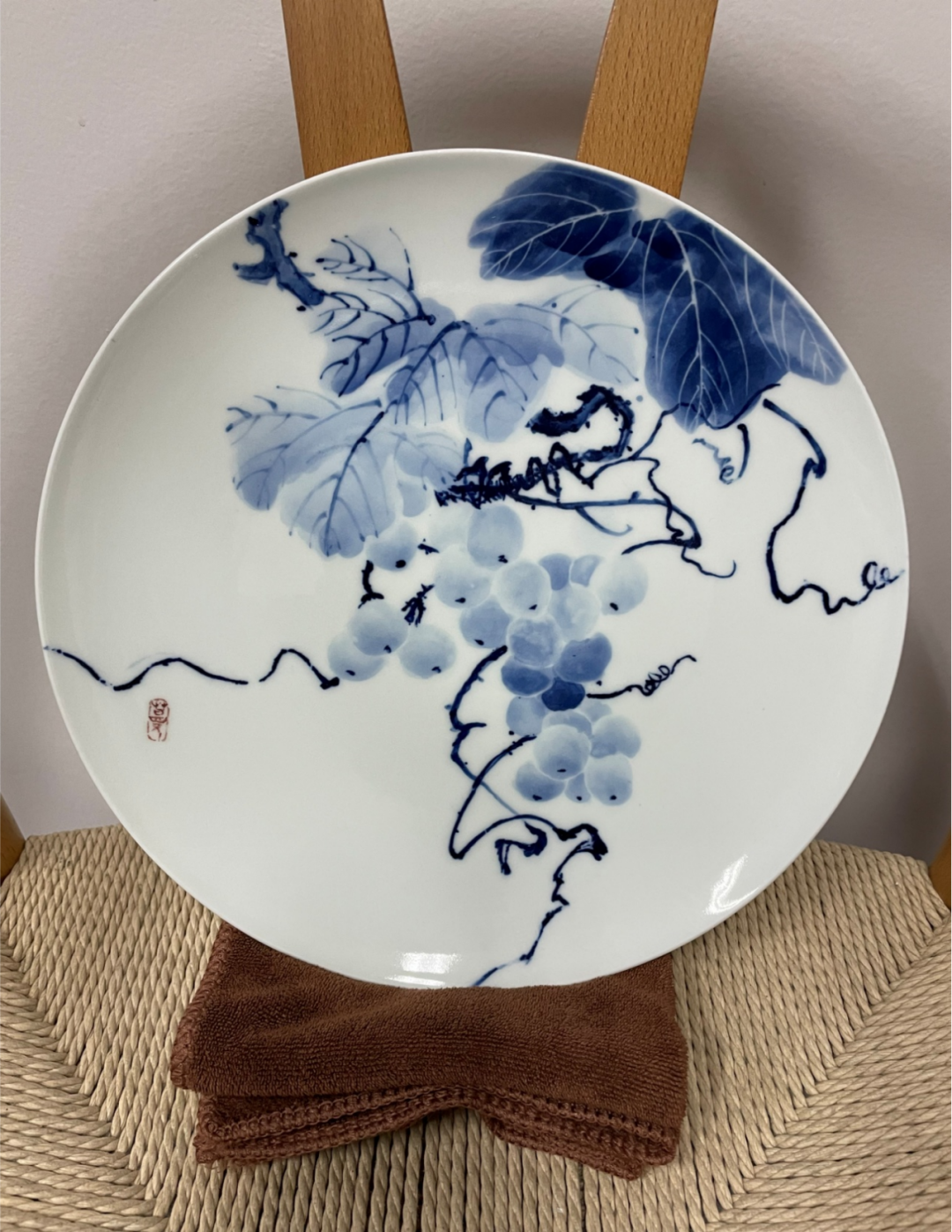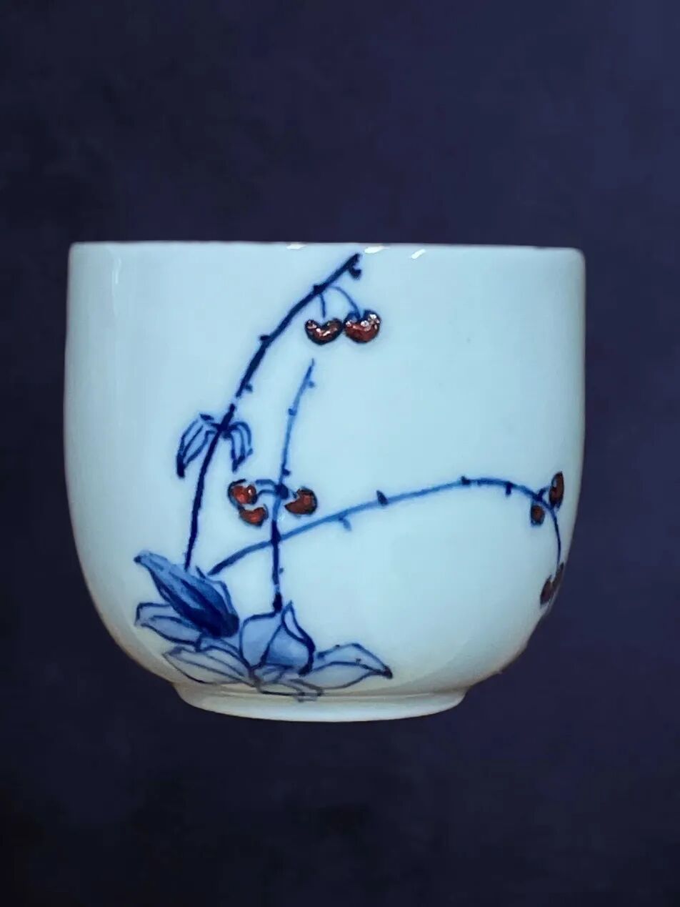 一星期后小蔓拜张树珍女士为老师,学习青花分水。老师带小蔓来到为宇延伸路的作坊开始画青花,也画了两件作品:青花分水“葡萄”瓷盘(图4~5)和青花花卉杯(图6~8)。