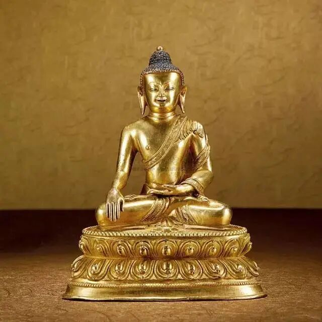 此尊十四世纪释迦牟尼佛,表现了释迦在菩提迦耶大菩提树下,成道时的情景。据佛传故事,释迦牟尼佛在菩提树下入定,不为美色妖魔所动,战胜魔军,开悟菩提,一手禅定,一手触地,所以此种姿态,亦称成道像。