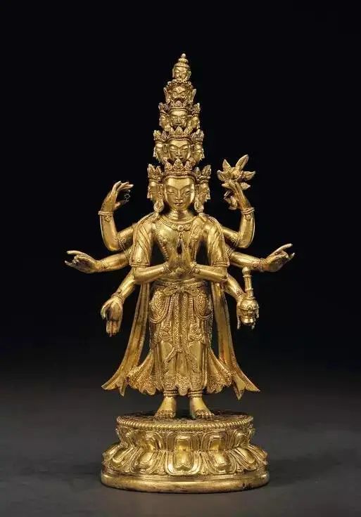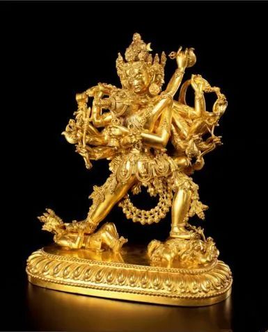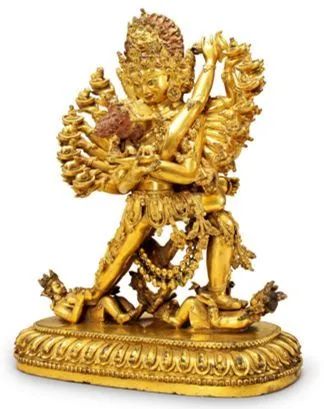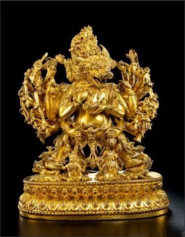 现存金铜立像中,迄今无可与之相较的独身大威德金刚。这尊造像全身鎏金的质感和光泽,完全将大威德金刚本尊的智慧、勇猛、精进、威力无比的法相呈现,是西藏鎏金工艺的历代同类佛像之佼佼者。