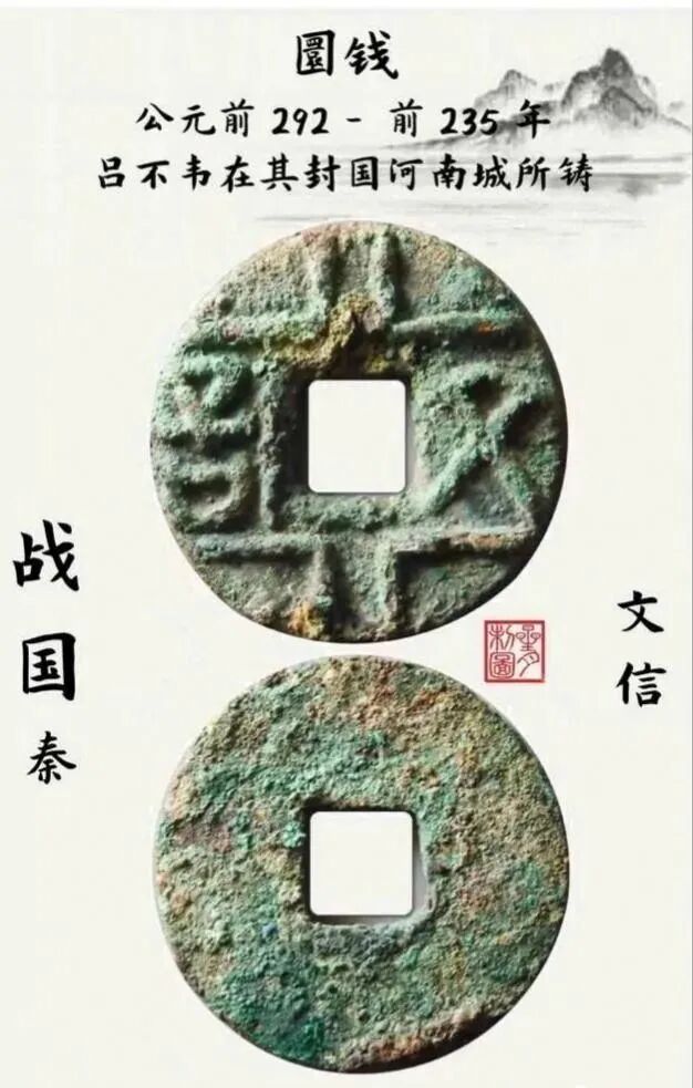 有这样一枚铜钱,出处一直未有定论,宋代以来很多学者为其争论不休。上面图中叫它“文信”,多么富含文化气息的名字,一看就来自先秦。自宋代以来,一些泉谱中出现了这枚铜钱,当时的学者对先秦文字已经研究很透彻,右侧显然是个“文”字,然而左侧文字,至今没有人能给出明确的答案。我们知道,钱币铭文都是有意义的,如:计重、记值、纪年、纪地。近代学者罗伯昭、郑家祖二位先生认为,文阳乃地名,实为纪地钱,所纪之地,极可能是“渔阳”或者“汶阳“。前者在辽东、后者在山东,都与前面所说的战国强秦没有什么关系。近代学者王献唐在考证了诸多文献之后,给出了确定性的答案,这枚钱币上的文字实为“文信“。乃是一枚“纪官钱“,所纪为铸造者的官职,遍阅史料,被封“文信“官位、爵位的,似乎只有两人。第一个是西汉初年的楚元王刘交,他随刘邦入关有功,被封为“文信君”,然而刘交只有称号而无封地,不太可能行铸钱之举。另外一个是秦相吕不韦,他在秦庄襄王元年(公园前249年)因拥立之功,被封为丞相,封爵“文信侯“。这样一来有点合乎大家的心理预期,这枚钱会出自鼎鼎大名的“亚父“之手?他可是有足够的声望、实力和财富,更重要的是,钱币铭文“文信”很符合战国时代篆字的风格。1955年,考古工作者在洛阳西郊汉河南城遗址内发掘了一枚古钱范,正是这枚古钱,出土的地点,似乎正是吕不韦封邑之所在。在没有更多直接证据的前提下,这种观点被普遍接受,于是这种古钱被公推为“文信钱“。很多人愿意相信它是吕不韦在封邑洛阳所铸,他是秦相,同时也是商人,他铸造钱币,方便行商,更为攫取财富。事情到此,似乎就可以告一段落了,然而学者们心中仍有疑惑。战国七雄中,类似的钱币造型(孔方钱)与东方的齐国非常相似。另外,钱币表面的四曲文,经学者考证为“行”字,与北方的燕国颇有渊源。这诸多问题,仍待破解,这枚铜钱的身世似乎又模糊起来。但有一点大家要注意,目前除拍卖行之外,市面上应该没有真的,如果您是河南人,又偏巧在自家地里挖到一枚,那将是上天的恩赐,好好保存吧。