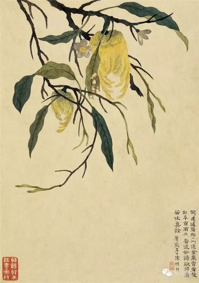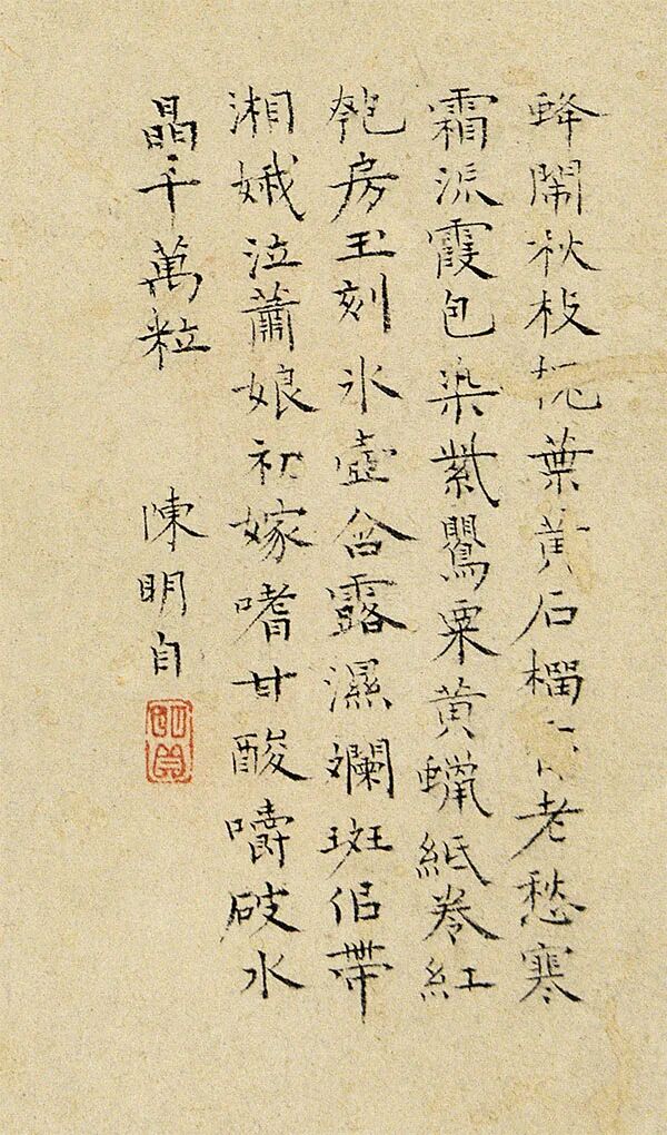 蜂闹秋枝槐叶黄,石榴□老愁寒霜。流霞包染紫莺(罂)粟,黄蜡纸卷红匏房。玉刻冰壶合露湿,斓斑侣带湘娥泣。萧娘初嫁嗜甘酸,嚼破水晶千万粒。陈明自。