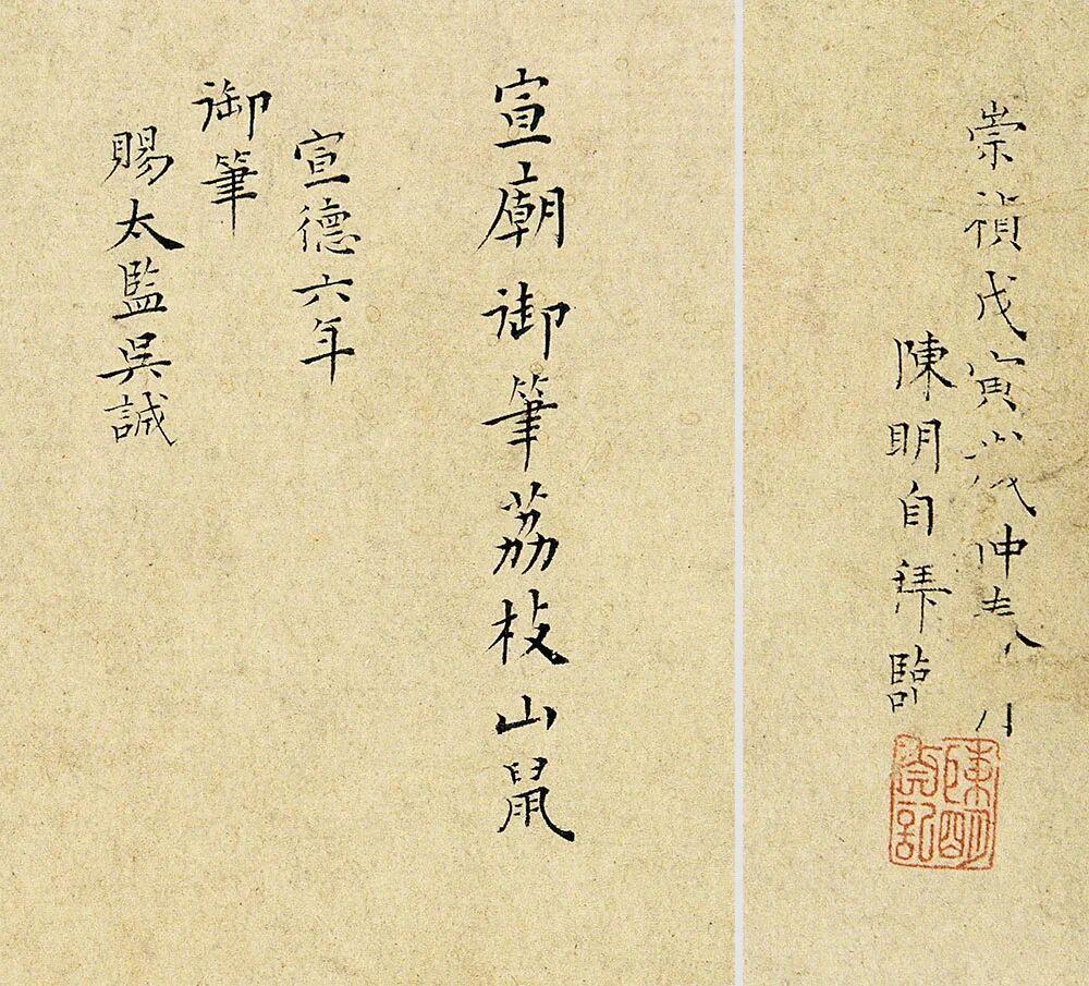 宣庙御笔荔枝山鼠。宣德六年御笔,赐太监吴诚。崇祯戊寅岁仲春月,陈明自拜临。
